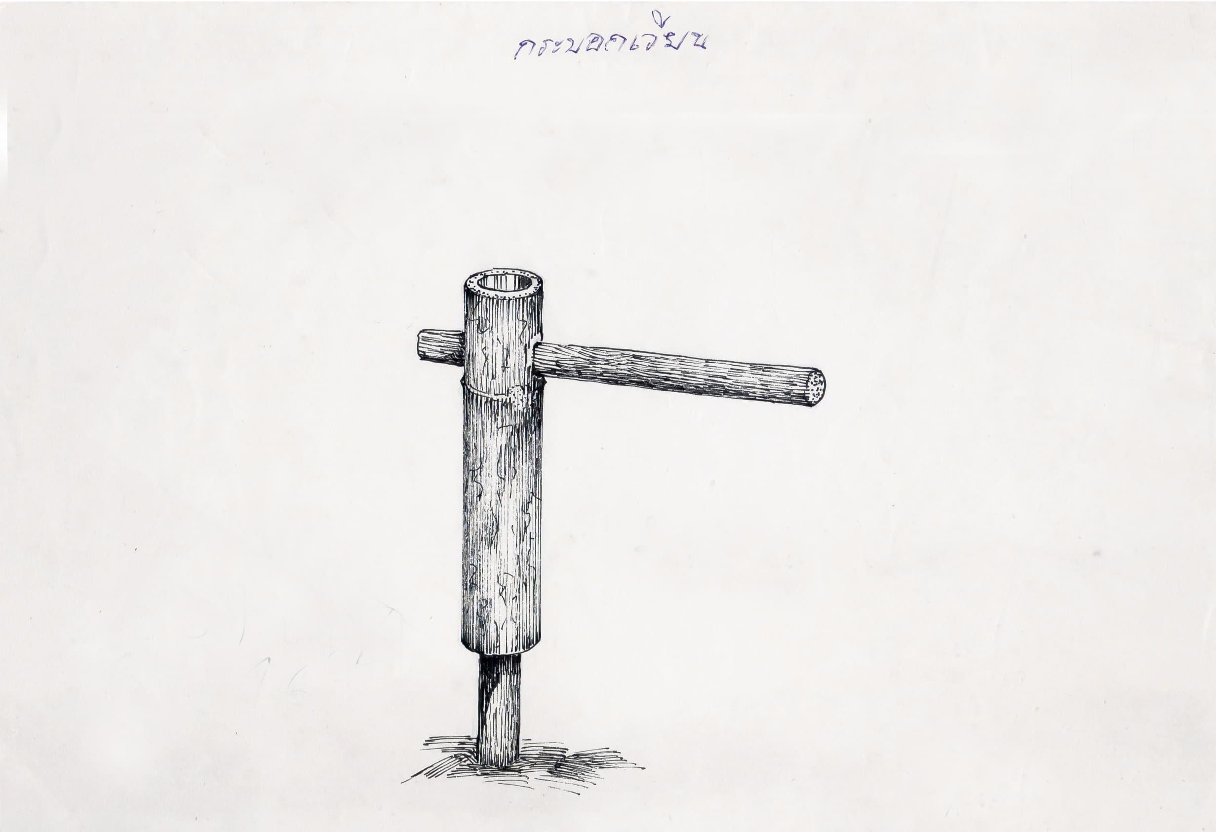 ๒. หาไม้กลมแข็งแรงมา ๑ ท่อน เพื่อทำเป็นหลักแกนสำหรับสวมกระบอกไม้ไผ่ที่ติดแขนเรียบร้อยแล้วลงไป ไม้แกนจะต้องเหลาส่วนบนให้เล็กกว่าส่วนล่างที่จะใช้ปักลงดิน ปักเสาแกนลงดิน ให้แน่น ไม้แกนนี้เมื่อสวมกระบอกไม้ไผ่ลงไปแล้วจะต้องไม่หลวมหรือคับจนเกินไป เพื่อความสะดวก ในการเกาะเดินของเด็ก
